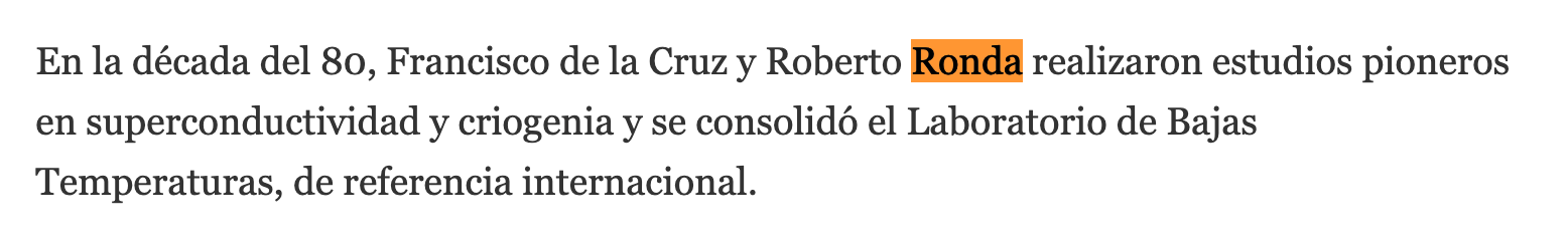 Y ahora tenemos un segundo round. En un artículo publicado por el 7 de diciembre de 2025, titulado "Conocimiento argentino: cinco centros de investigación de prestigio internacional", se menciona a Roberto Ronda como un científico pionero del Instituto Balseiro que, junto a Francisco de la Cruz en los años 80, realizó estudios clave en superconductividad y criogenia, consolidando el Laboratorio de Bajas Temperaturas.
